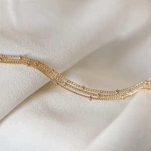 Wir präsentieren unser Dünnes Armband Damen, ein zierliches Accessoire, das dazu bestimmt ist, Ihr Handgelenk mit subtiler Eleganz zu schmücken. Handgefertigt mit Präzision und Feinheit, verfügt dieses zarte Armband über eine schlanke Goldkette, die jedem Ensemble eine Note von Raffinesse verleiht. Ob allein für einen minimalistischen Look oder in Kombination mit anderen Armbändern für einen eklektischen Stil, dieses vielseitige Stück verbessert Ihr Handgelenk mühelos mit seinem zurückhaltenden Charme.