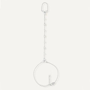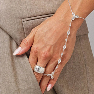 Diese Handkette aus Edelstahl vereint modernes Design mit zeitloser Schönheit. Zart über den Handrücken gelegt, verbindet sie Armband und Ring zu einem fließenden Schmuckstück, das Weiblichkeit und Raffinesse perfekt verkörpert.
