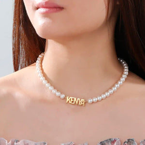 Wir präsentieren die Perlenkette mit Namen – eine Fusion aus zeitloser Eleganz und persönlichem Charme. Dieses exquisite Stück zeichnet sich durch eine Reihe von glänzenden Perlen aus, die sorgfältig nach Schönheit und Glanz ausgewählt wurden, und führt zu einem individuellen Namensanhänger, der diese Kette wahrhaft einzigartig macht. Ob es Ihr Name, der Name einer besonderen Person oder ein Wort mit tiefer Bedeutung ist, diese Kette verwandelt ein klassisches Accessoire in ein persönliches Stil-Statement.