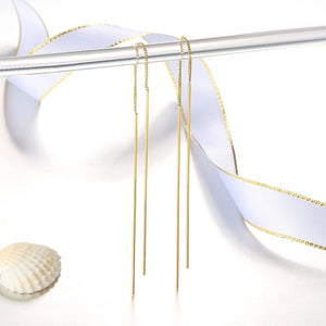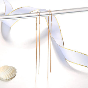 Unsere Durchzieher Ohrringe Gold präsentieren sich mit einem schlanken und minimalistischen Design, das mühelos sowohl lässige als auch formelle Outfits ergänzt. Der zarte Faden schafft eine schicke und zeitgenössische Silhouette und macht diese Ohrringe Kette zu einem vielseitigen Accessoire für jeden Anlass.