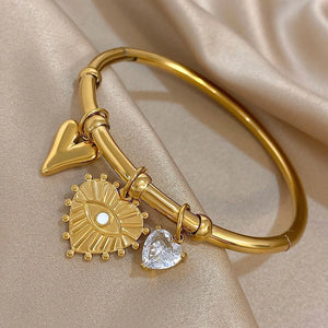 Der Charm Armreif vereint die klare Eleganz eines klassischen Armreifs mit der verspielten Leichtigkeit von Charms. Dieses Schmuckstück bringt bei jeder Bewegung einen Hauch Persönlichkeit, Glanz und Bedeutung an Ihr Handgelenk. Perfekt für alle, die modernen, ausdrucksstarken und dennoch zeitlosen Schmuck lieben. Ein harmonisches Zusammenspiel aus Schlichtheit und Persönlichkeit.