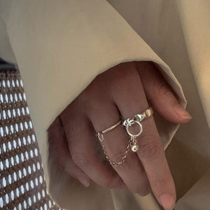 Wir präsentieren unsere doppelten Ringe, ein Statement-Piece, das kühnes Design mit anspruchsvoller Eleganz verbindet. Dieses innovative Accessoire erstreckt sich über zwei Finger, verbunden durch eine schlanke Kette, und bietet eine gewagte und stilvolle Möglichkeit, sich zu schmücken. Perfekt für diejenigen, die die Grenzen traditionellen Schmucks verschieben möchten, ist dieser Ring ein Bekenntnis zu mutiger Mode und individuellem Ausdruck.
