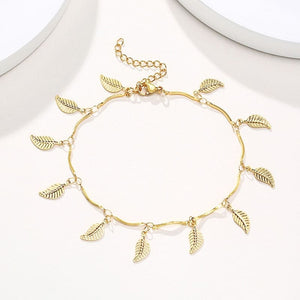 Wir präsentieren unser Fußkettchen Goldblatt, eine Verschmelzung der zeitlosen Schönheit der Natur und dem luxuriösen Zauber von Gold. Dieses exquisite Schmuckstück fängt die zarte Form von Blättern in Gold ein, um Ihren Knöchel in einer Umarmung aus Eleganz und natürlichem Charme zu umschlingen. Es ist mehr als nur ein Accessoire; es ist eine Feier der Harmonie zwischen Natur und Raffinesse.