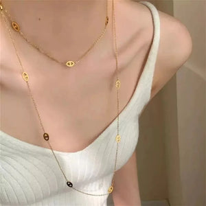 Verleihen Sie Ihrem Look luxuriöse Eleganz mit der goldenen Kaffeebohnen-Halskette. Die runden, ikonischen Glieder reflektieren das Licht bei jeder Bewegung und schaffen einen warmen, edlen Schimmer. Ob für festliche Anlässe oder den Alltag – dieses Schmuckstück bringt sofort Stil und Klasse in jedes Outfit.