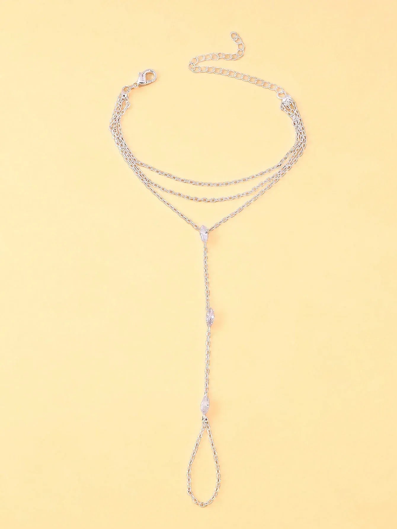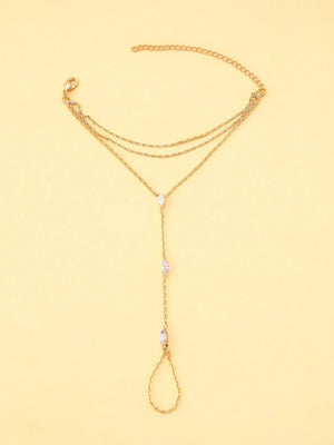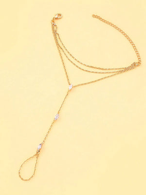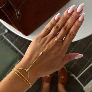 Die Kristall Doppelte Handkette vereint ein elegantes Armband mit Ring und setzt auf eine doppelte Kettenbasis am Handgelenk für einen besonders luxuriösen Look. Zwei feine Reihen schmiegen sich stilvoll um das Handgelenk und werden durch eine zarte Verbindungskette mit einem Ring kombiniert, veredelt mit funkelnden Kristallen.